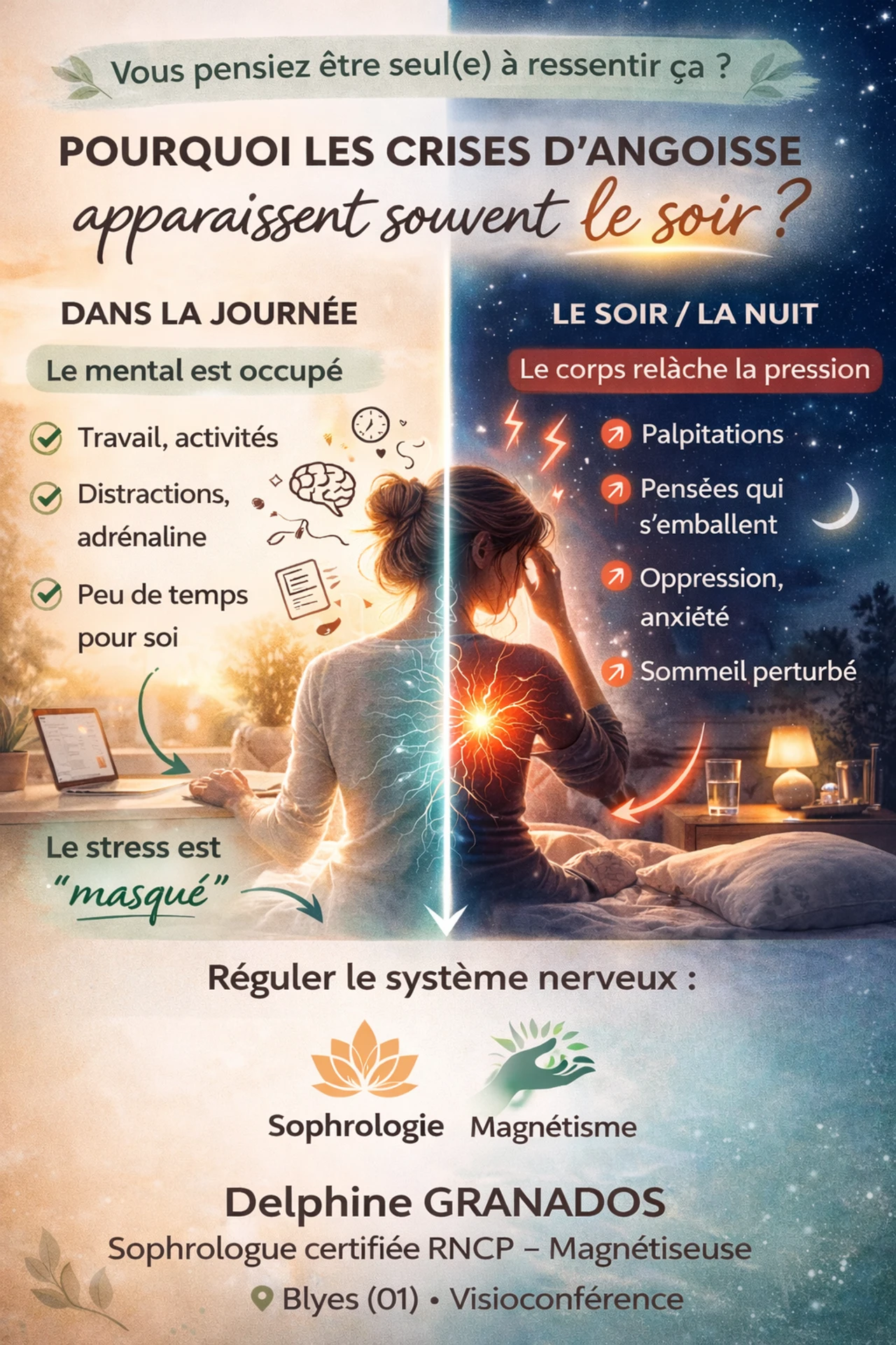🌙 CRISE D’ANGOISSE LE SOIR OU LA NUIT : POURQUOI APPARAISSENT-ELLES AU MOMENT DE DORMIR ? Les crises d’angoisse le soir ou la nuit touchent de...